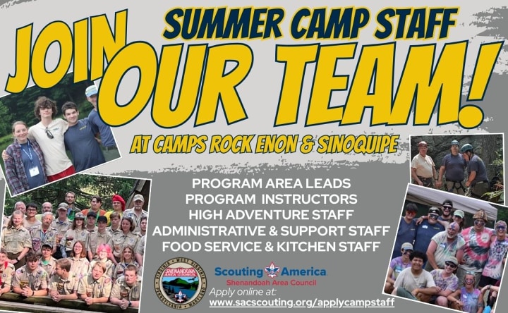 Being on staff offers a different experience as you help to "Deliver the Outdoor Promise" of Scouting working as a member of our team. No matter what your interest (program or support staff) we probably have a position for you. College students, teachers, school cafeteria workers, retired or semi-retired persons and youth age 14+ are all welcome. Prior experience with Scouting is not required. We even offer paid internships for college students. Must submit to a background check.